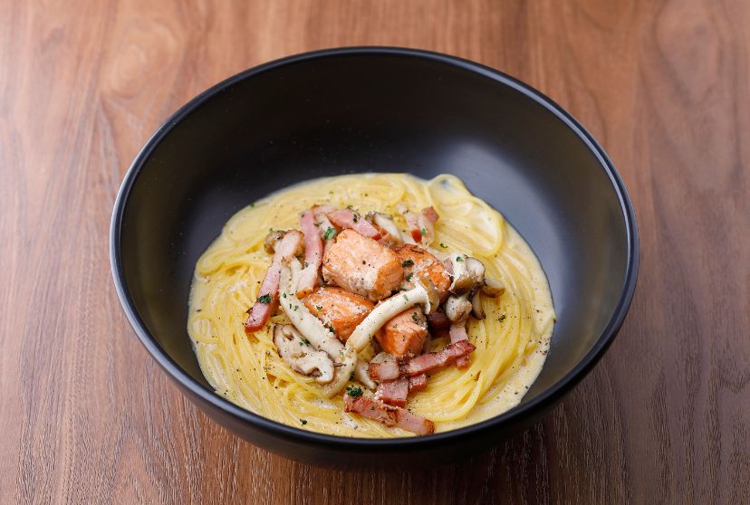 人気の「カリカリベーコンのクリーミーカルボナーラ」を秋仕様にアレンジした限定メニュー。ごろっとした大きなサーモンと香り高いキノコがポイント。濃厚なソースに素材の旨みが重なる至福の味わいです。