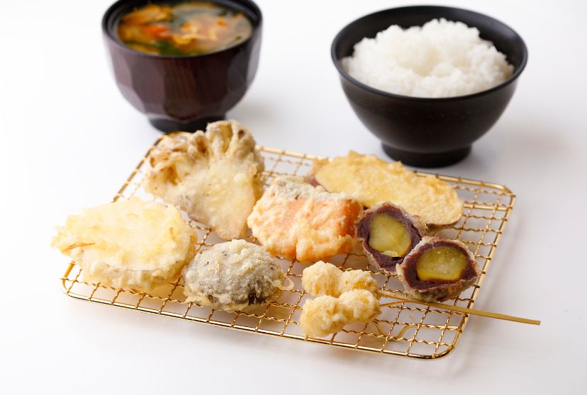 旬の野菜やキノコ、秋鮭など秋の味覚をふんだんに使った、季節を感じる天ぷら定食。サクッと揚がった熱々の天ぷらは、どれもネタが大ぶりで食べごたえ満点。デザート感覚でいただく秋限定の「栗あん天」にも注目です。