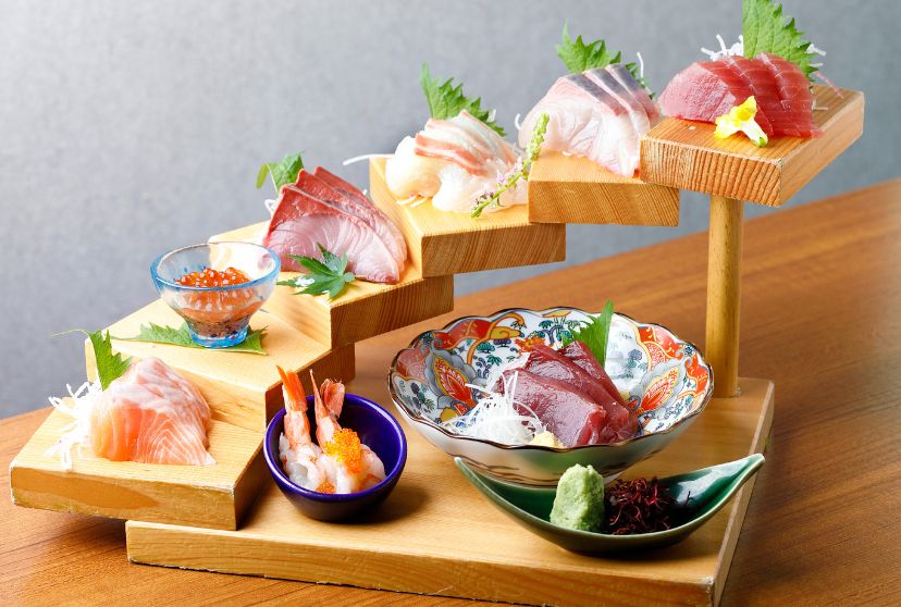 秋は脂ののった魚が美味しい季節。ブリ、カンパチ、カツオなど旬の鮮魚を盛り合わせた、目にも楽しい“階段盛り”のお刺身セットです。一段ずつ異なる魚が彩る立体的な盛り付けは、思わず写真を撮りたくなる美しさ。
