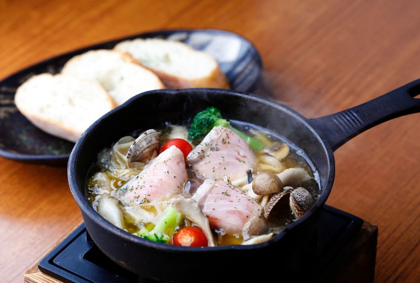 キノコと脂ののったサーモンを使用した、季節限定のアヒージョ。アサリやブロッコリー、トマトなど彩り豊かな具材もたっぷりで、満足感も◎。素材の旨みが染み込んだ熱々のオイルは、バゲットにたっぷり絡めてどうぞ。