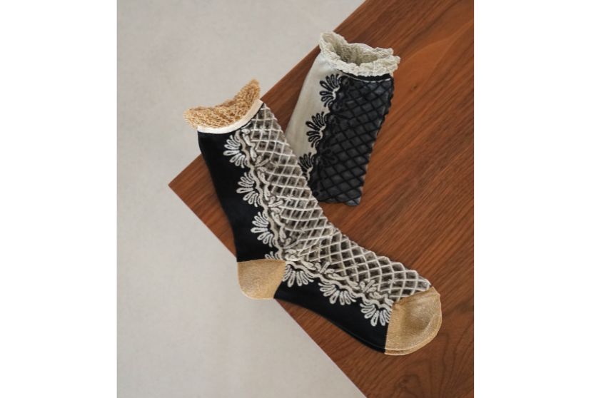 繊細なレース模様をあしらった、シアーで軽やかな履き心地のソックス。クラシカルな雰囲気とシックなカラーが秋らしい足もとを演出します。パンプスやフラットシューズとも好相性で、普段使いはもちろん、少し特別な日にもおすすめ。ヌケ感を添えつつ、装いすべてを引き立ててくれます。