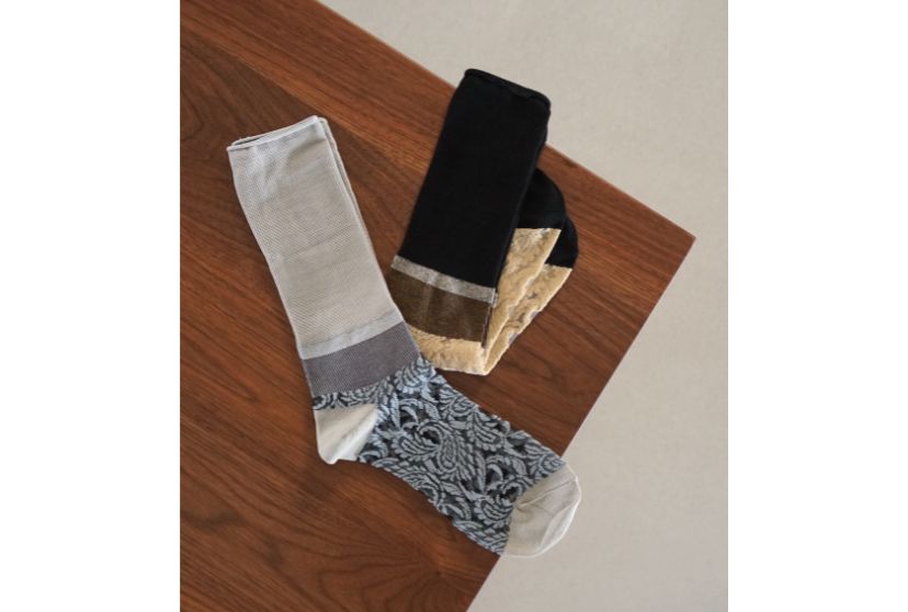 ペイズリー柄の部分をシアー素材で切り替えたソックス。やや長めの丈とシックなカラーで秋の装いに映えます。パンプスやスニーカーにも合わせやすく、足もとにさりげない個性とヌケ感をプラス。柄物ながら主張しすぎず、デイリー使いにもぴったりです。