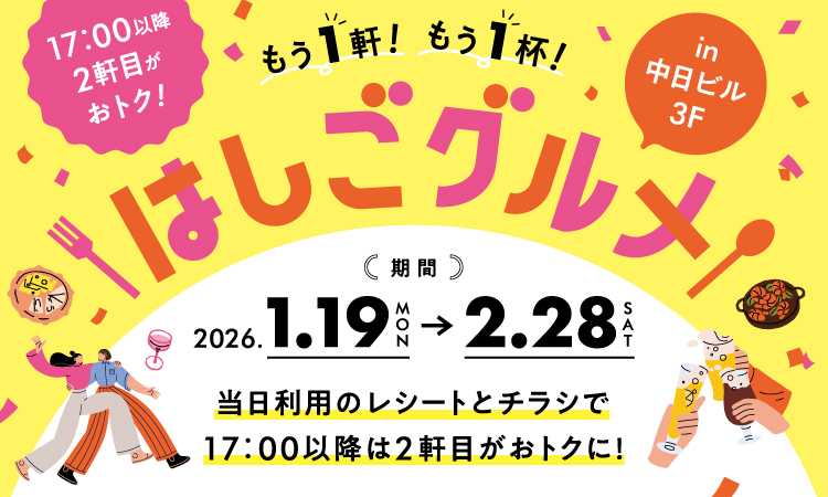 各地のおいしい特産品に舌鼓を打ち、観光パンフレットなどもご覧いただき、中日ビルで小旅行気分を味わってみませんか?