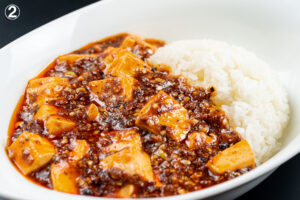四川の高級花椒「漢源花椒」を使用し、香り高く痺れる辛さがクセになる人気の一品。來杏自慢の本格四川麻婆豆腐を贅沢にご飯とともに楽しめます。