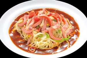炒め野菜の「カントリー」とベーコンやウインナーの「ミラネーズ」を合わせた、野菜と肉の旨みが調和する人気No.1の定番あんかけスパです。