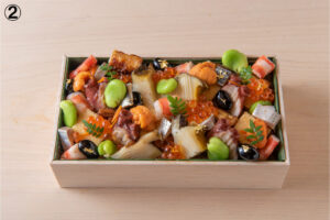 車海老、蒸し鮑、ウニなど贅沢な海の幸を盛り込んだ、豪華な江戸前ばらちらし鮨。豊かな具材が織りなす、彩りも味わいも贅を尽くした一品です。