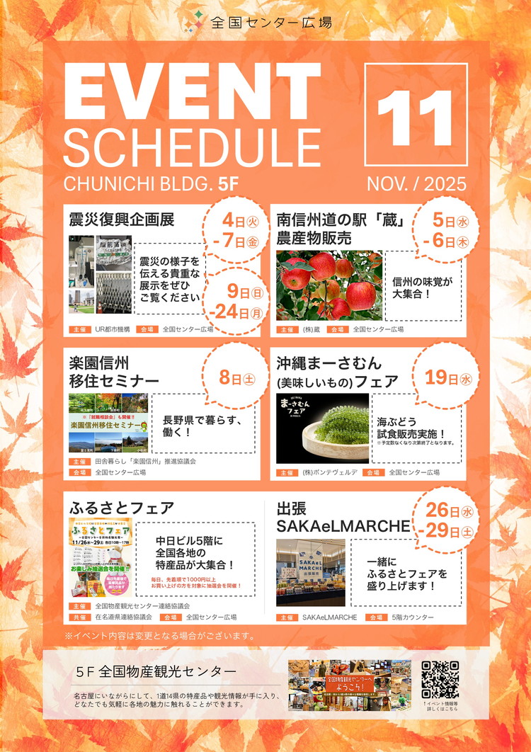 5F 全国センター広場にて開催する、11月のイベントスケジュールです。