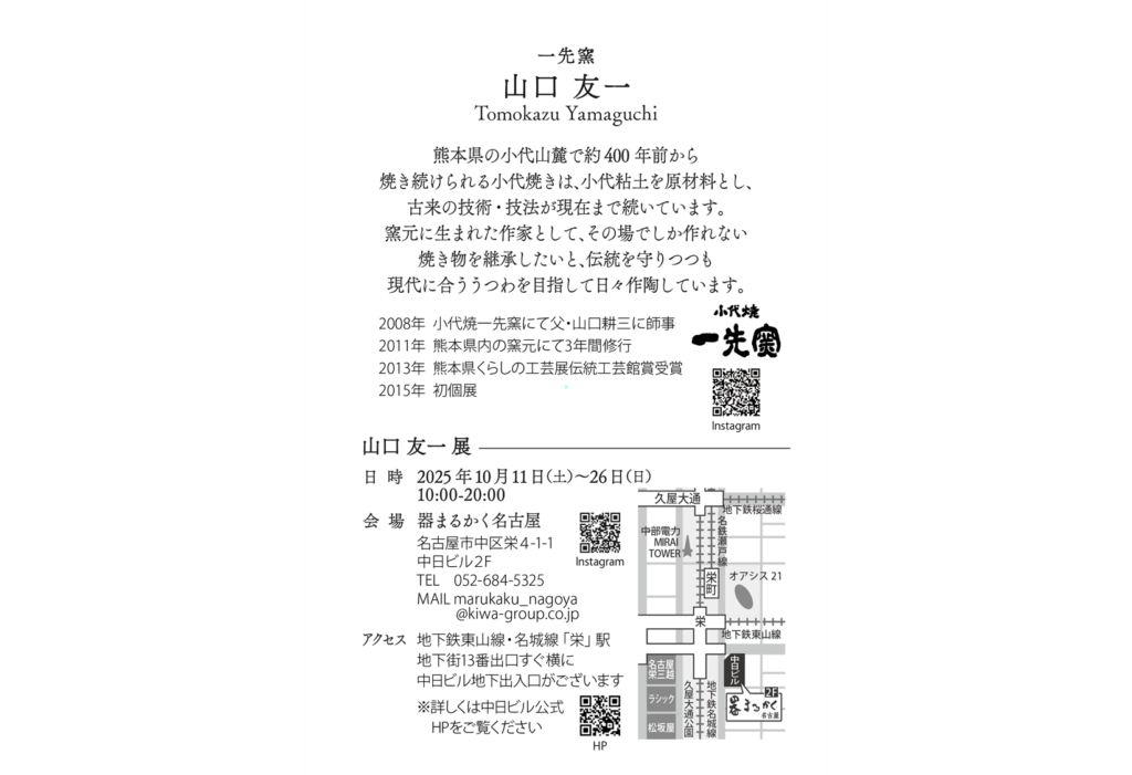 「器まるかく名古屋」では初となる、熊本県小代焼一先窯の山口友一さんの個展。