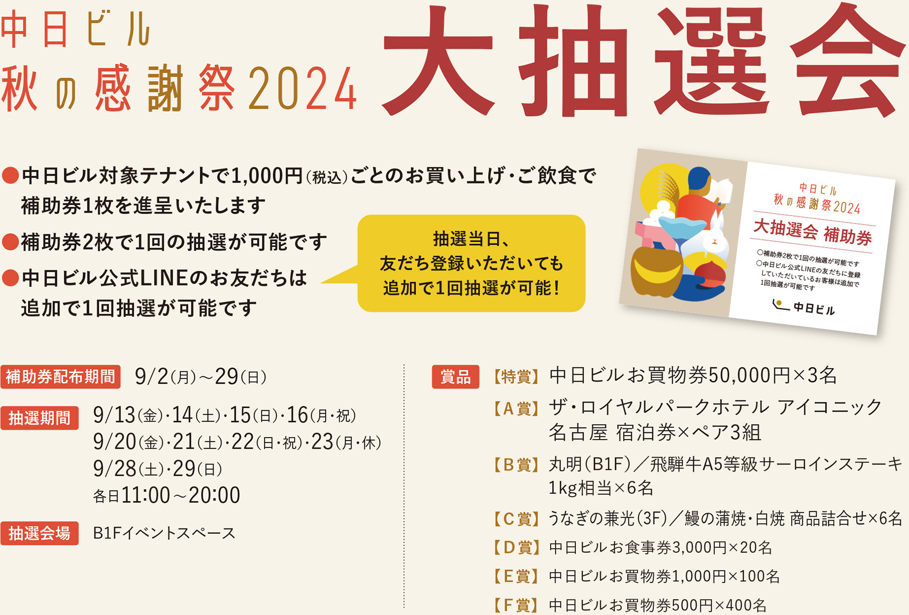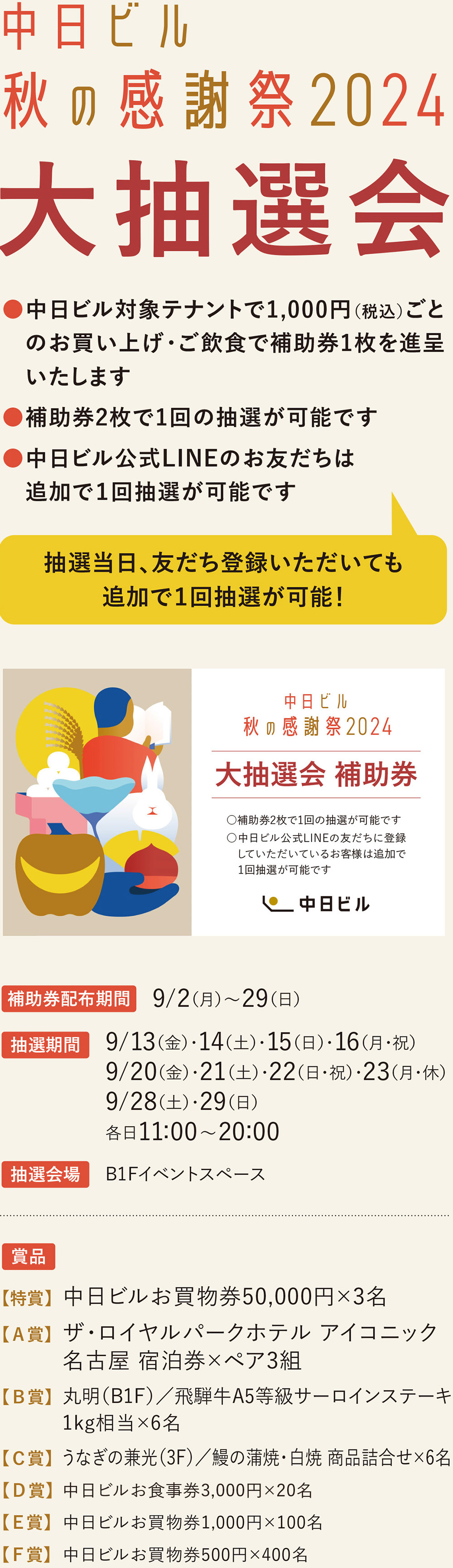 開業から約半年のご愛顧に感謝して「中日ビル 秋の感謝祭2024」を9月2日(月)から9月30日(月)の期間で開催いたします。